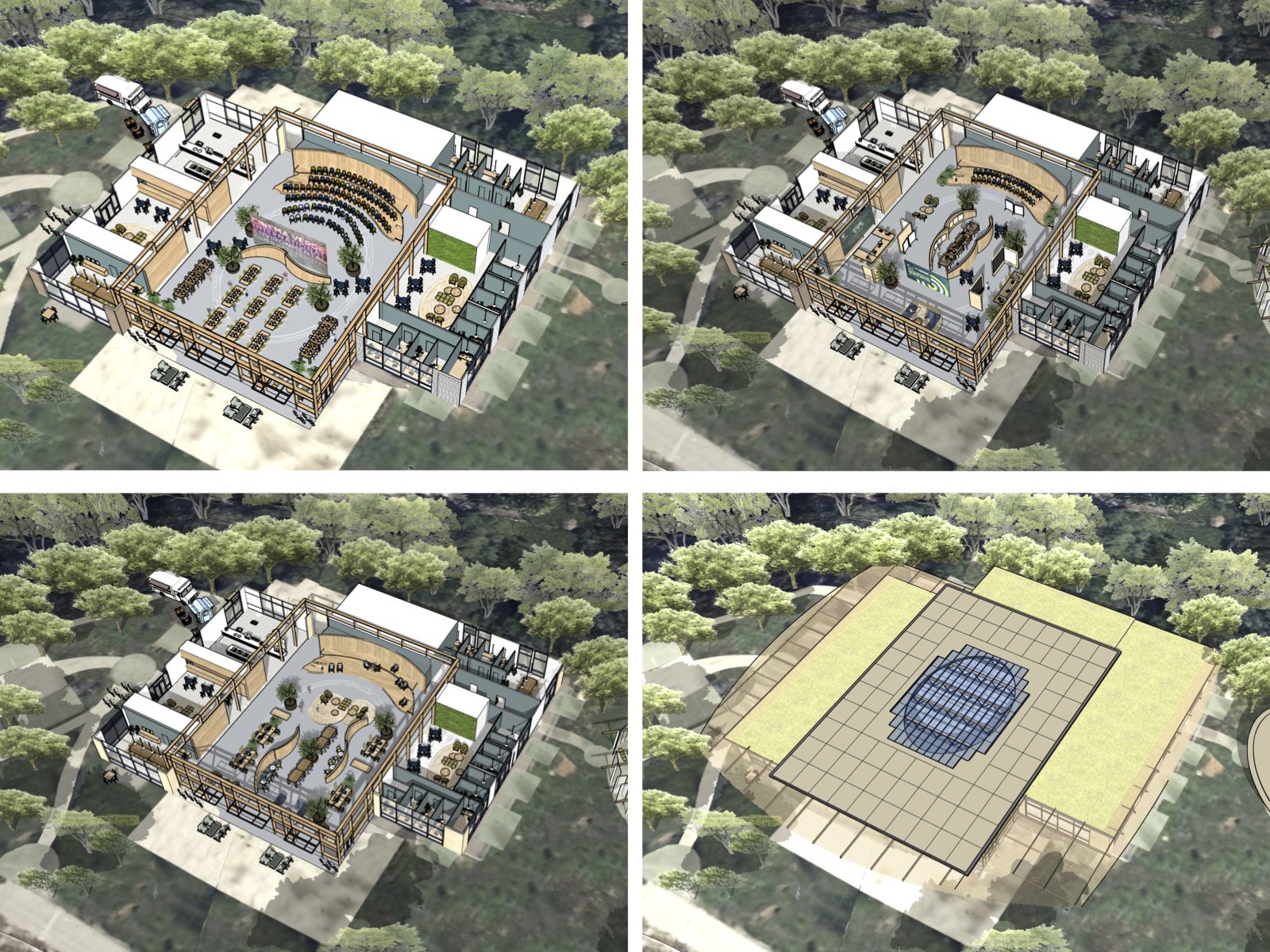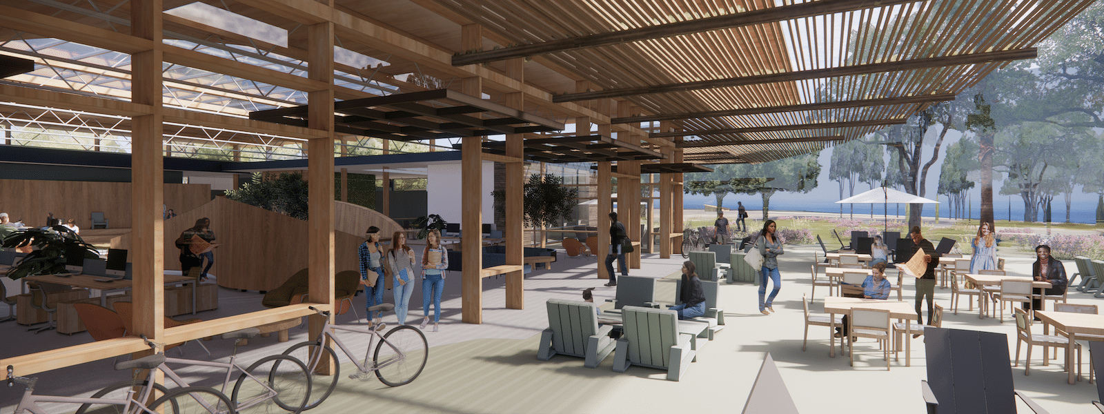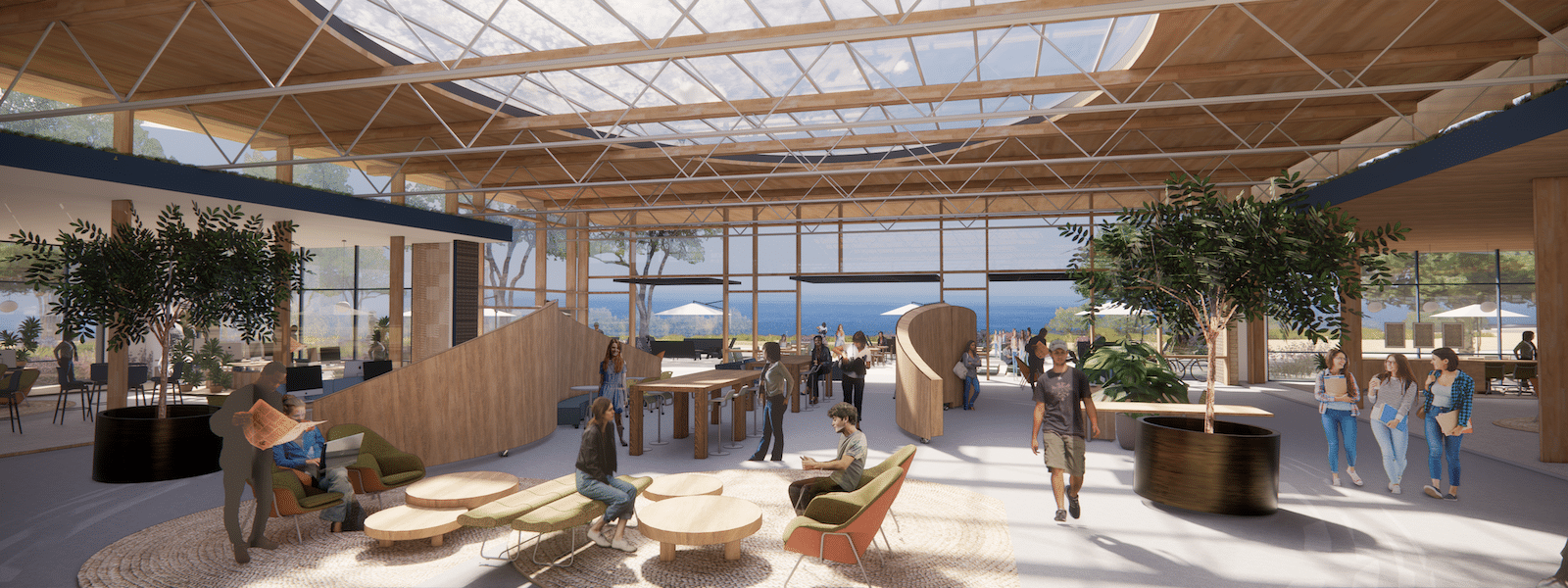 Concept design for the adaptive reuse of underutilized buildings located on the South Knoll of the UCSB Devereux site focuses on a bold and inspiring biophilic identity for a collaborative hub dedicated to environmental stewardship and creates innovation.